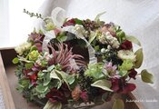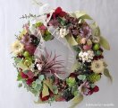 ベージュやグレージュのニュアンスカラーが美しい、ボリューム感のあるスワッグです。白バラ、ドライフラワー風の紅バラをアクセントにどこか時間を超えた幻想的な雰囲気も感じられてとても心惹かれます。 また、スワッグの向きや花器に応じた飾り方を提案して下さっているので、これから色々な表情を見つけて行ければと思います。今回も素敵な作品をありがとうございました。