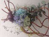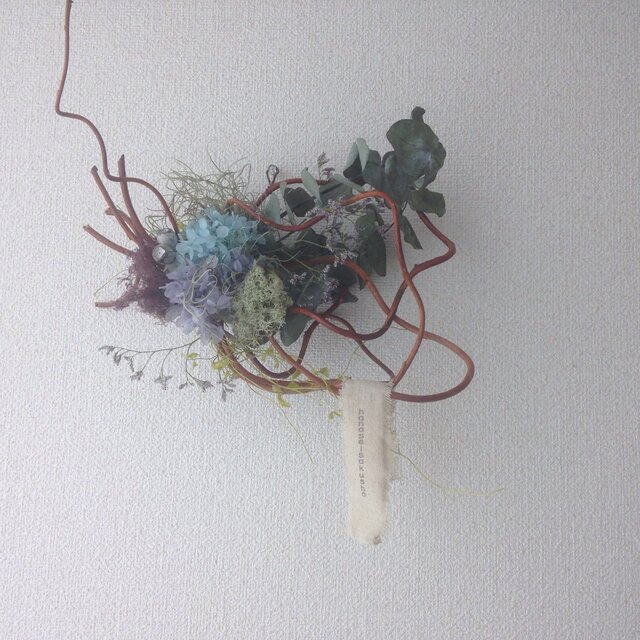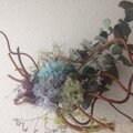柳の言うままに曲げ、ユーカリのドライフラワーと長く保つプリザーブドフラワーを合わせました。