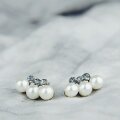 ☆光沢感のホワイトパールをグレースワロフスキーラインストーンと合わせて仕立てました。かわいいビンテージ調のビアスです。いろんなシーンで使っていただければと思います。