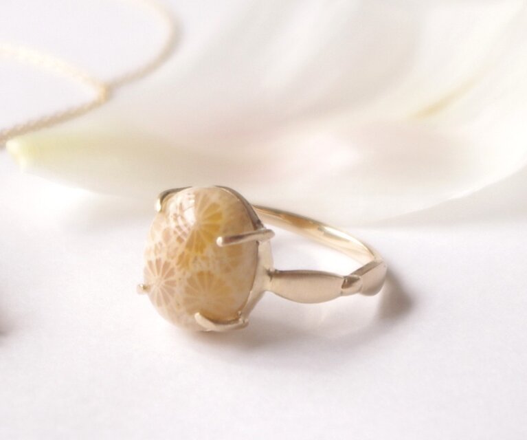 K10のやさしいゴールドカラーとフォッシルコーラルのカラーがマッチし、個性的ながら肌馴染みの良いリングができあがりました。