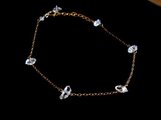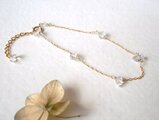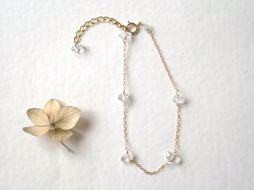 NY州ハーキマー産のハーキマーダイヤモンドをステーションブレスレットに仕立てました。「ハーキマーダイヤモンド」とはNY州ハーキマー地区で採取されるクリスタルです。独特の両端が尖ったカットはダイヤモンドのような透明な煌めきがあります。等間隔に散りばめた5石のハーキマーダイヤがシンプルでいて、涼しげな透明感がこれからの季節にぴったりです。アジャスターのエンドにも1石ぶらさげて。
