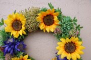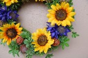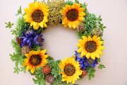 これからの時期にピッタリなひまわりが盛りだくさんのリースです。ちょっと大きめのひまわりに負けないくらい実ものたちやブルーのお花も存在感があって全体的にインパクト大です。なのでこのリースを飾ると、まるでライトをつけたように周りがとっても明るい雰囲気になります。アーティフィシャルで出来ていますので室内外ともに飾れます。直径約31cm、高さ7cm。
