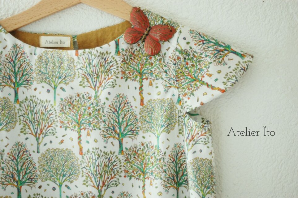 Liberty:the artist tree キャップスリーブワンピースです。(ちょうのブローチは撮影小物です。)