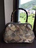 華やかな色、柄の美しい時代帯のがま口手さげです。
