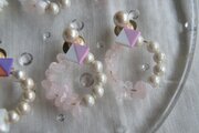 コットンパール、2色の三角パーツ、ラウンドメタル、透明の水晶と白いマザーオブパールという石を使って、夏らしい作品を作りました。