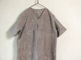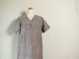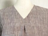落ち着いたパープルグレーの霜降りのあるカディ生地で、夏らしく涼し気なVネックのワンピースを仕立てました。胸元に小さなタックも入れ、アイポイントにしています。