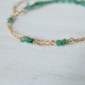 同系色のシルクコードに宝石質のエメラルドを通し、ダブルチェーンとの