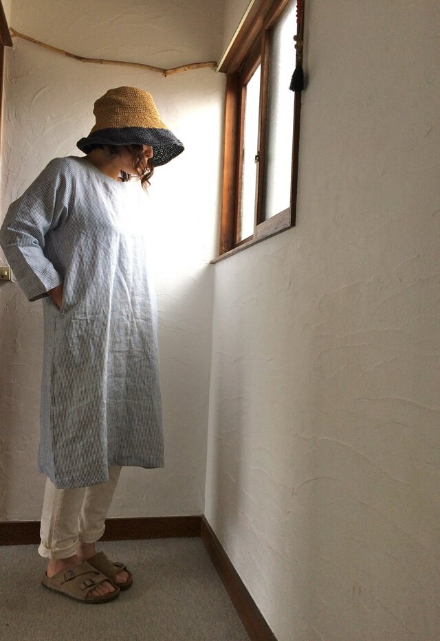黒×キナリのストライプのリネン生地は縦の線をもハッキリとしております、私のサイズにも余裕をももたせており細見え抜群です。何枚も購入させて頂き、ノンストレスとビックポケットのポイントが大人可愛いワンピース。大大大ファンです。美しい縫製にも重ね重ね心遣いに御礼申し上げます。ありがとうございました。