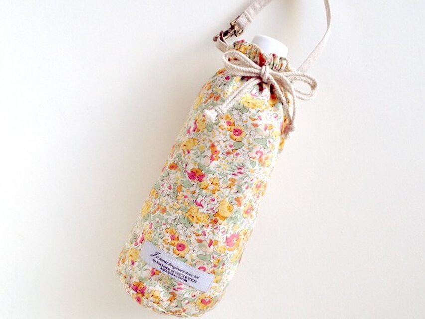 リバティの人気生地、Claire-Aude クレアオード(イエロー)とワッフルリネンの生地でペットボトルカバーを作りました。
