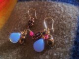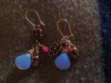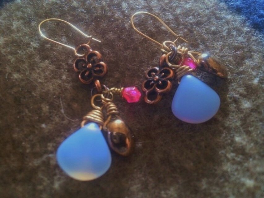 すりガラスのような質感の水色の花びらと可愛らしいブロンズ(銅色)の花びらやパーツなどで作りました。