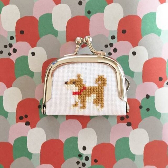 柴犬をクロスステッチで刺繍したミニがま口です。