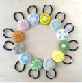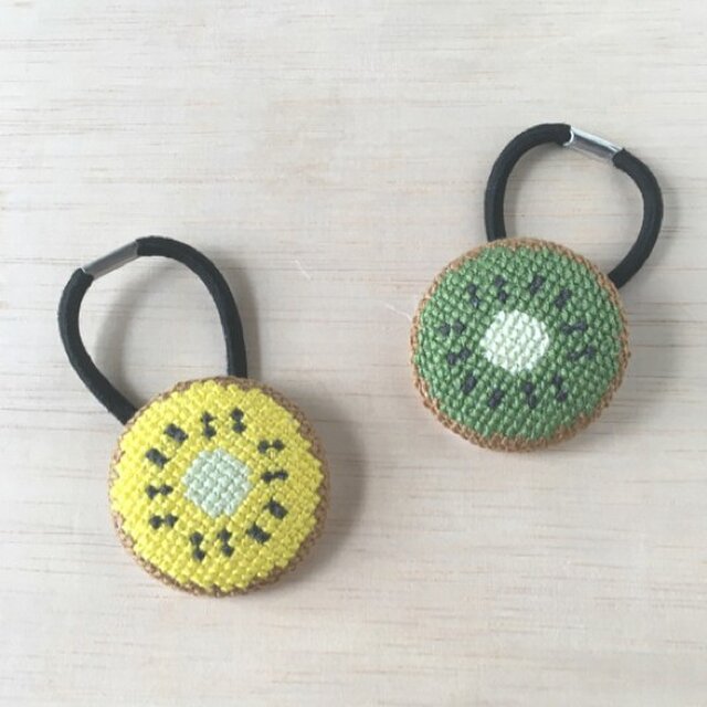ひとめひとめクロスステッチで手縫いした、キウイのヘアゴムです。