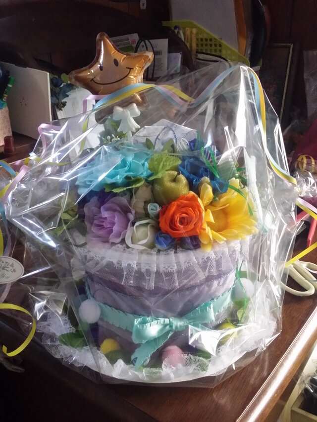 出産祝いにいかがでしょうか? 中に紙オムツがはいってます。 サイズはご希望のオムツサイズで。 上にプリザーブドフラワー(フェイクも使用)で飾り付けてます。 オムツ使用後はプリザだけ飾ってください。
