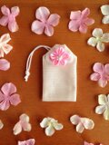 素敵なお守り袋が2つ届きました。 絞りの生地の色合いと大輪の花がとても華やかでキュートです。 白梅のものは、奥ゆかしさと気品を感じました。 どちらも大変気に入りました。大切に使わせていただきます♪