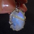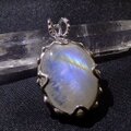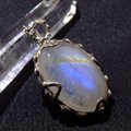 光の当たる角度によってブルーにイエローの光のラインが浮かぶレインボームーンストーンをシルバー枠のペンダントに仕上げました。