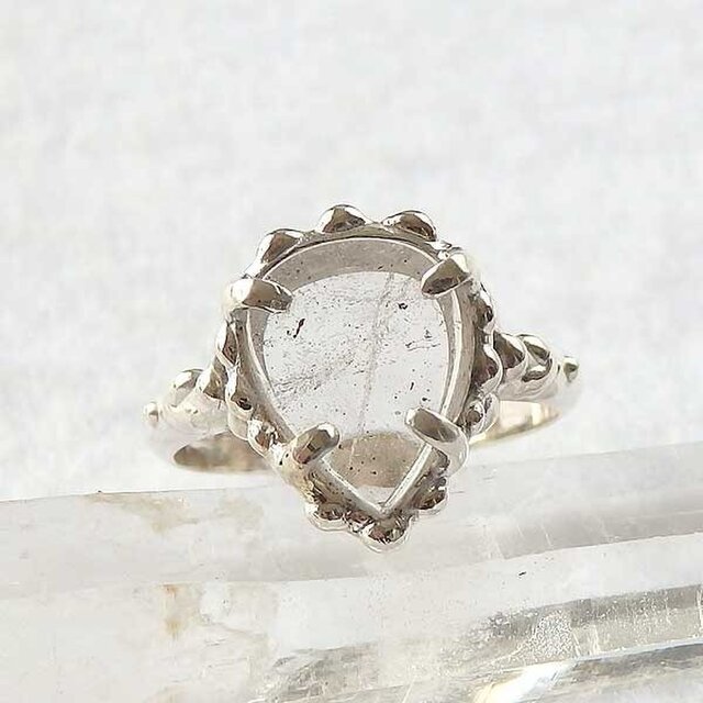 光の当たる角度によって内包されているヘマタイトが鮮やかなピンク色に輝くレア水晶 ピンクファイアークォーツを使用したリングです。