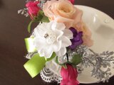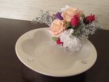 フラワー型が愛らしい真っ白なトレイに、サーモンピンクの可愛いローズ。周りをカラフルなホワイト、ルージュピンク、パープルなどのアーティフィシャルフラワーで飾り付けて、女性らしい柔らかな印象に仕上げました。