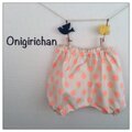 オフホワイト地に蛍光オレンジの前後同形のゆったりしたもも丈サルエルパンツです。