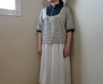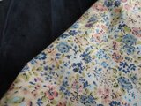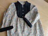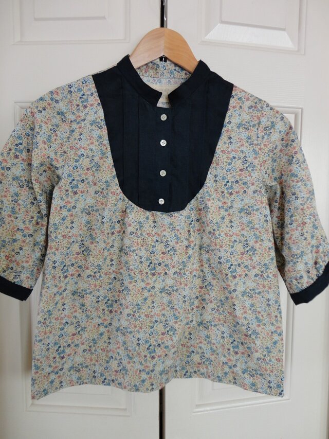 落ち着いた色合いの小花柄(綿シーチング)と、ネイビーリネンを合わせました。胸の部分にピンタックをほどこしています。