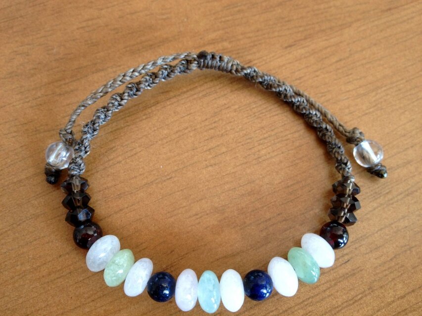 ミックスベリルを中心にご要望のラピスラズリとガーネットを組み合わせてマクラメブレスで仕立てました。