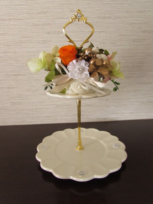 イギリスのアフタヌーンティーに使われるティースタンドをイメージした2段トレイに、まるでスイーツのようにプリザーブドローズとパール、シルクフラワー、デコレーションリボン、アーティフィシャルリーフをデコレーションしました。