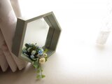デザイン性の高い六角形のミラーの片隅に、こぼれ落ちるようなプリザのフラワーポットをあしらいました。