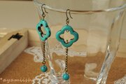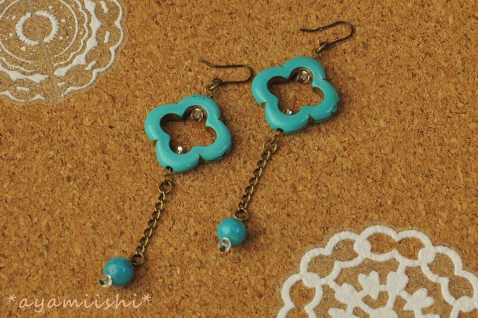 ターコイズ色のクローバーの形のウッドビーズを使って作ったピアスです。