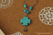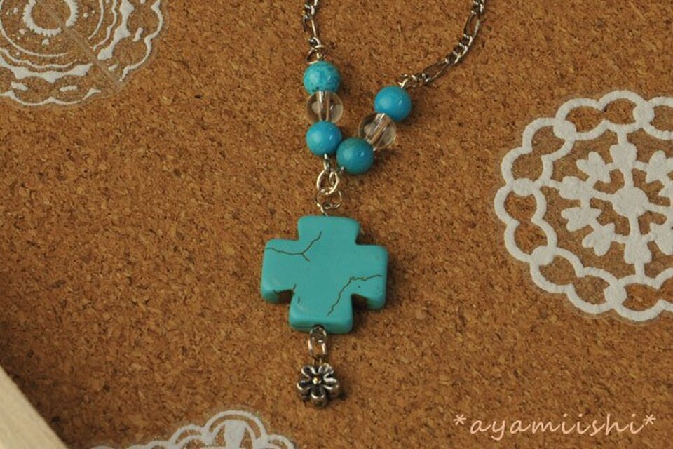 ターコイズ色のクロスの形のウッドビーズを使って作ったネックレスです。