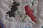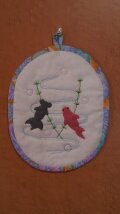 シャドウキルトというパッチワークの技法で製作していまして、布の一番表面に、オーガンジーを重ね、柔らかい色使いになっています。