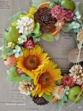 ひまわりをメインに りんごやオレンジスライス、黄色い実、そしてグリーンのラズベリーをアレンジしました。自然素材はムギワラギクをはじめ、松かさとバラの花のようなシダローズを選んで、自然の風合いをそえました。