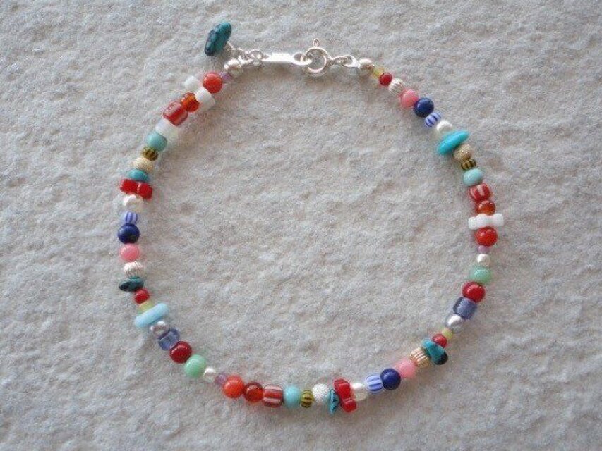 アンティークビーズ、天然石、グラスパール、silver925・14kgfビーズを組合わせたカラフルなブレスレットです。