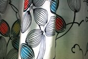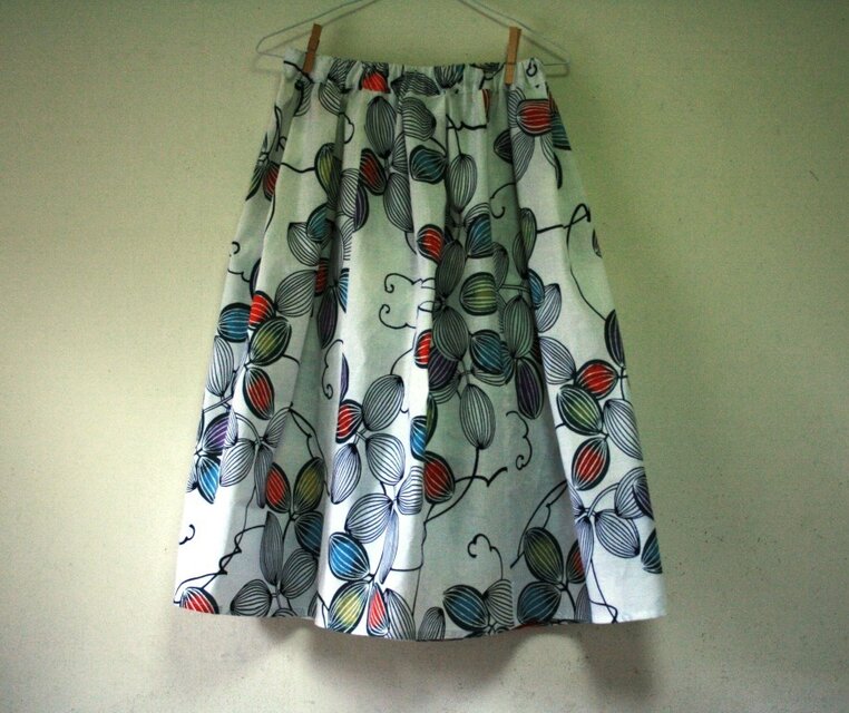 大胆にあしらわれた烏瓜模様の浴衣地でゴムスカートを作りました。ゴムを通すことで自然なギャザーができるシンプルなスカートです。以前に作った、腰回りはゴムタックスカートよりタイトなデザインで、腰から下のふくらみが少なく、よりさっぱりした印象です。浴衣姿ももちろん素敵ですが、このスカートは和風の印象を残しながらも、気軽に着ていただけて、蒸し暑い日にはうってつけと思います。綿なので、ご家庭でお洗濯OK。アイロンがけをする場合、てかりが出るおそれがあるので当て布をしてください。紺色のためさほど透け感はありませんが、気になる方は透けにくいベージュの下着やペチコートの着用をお勧めいたします。お部屋でリラックスウエア、夏のリゾートウエアとしてもお楽しみいただけます。