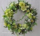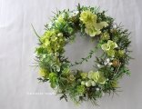 リース土台:ナチュラル素材 直径約20センチ リース素材:アーティフィシャルフラワ-(紫陽花・スノーボール・カーネーション・グリーンネックレス・グリーンの実・ユーカリ・ヒイラギ・アスパラガス・ホップ、など)、自然素材(ソフトサリグナム)