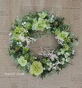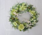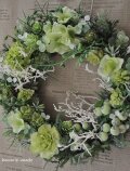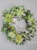 リース土台:ナチュラル素材 直径約20センチ リース素材:アーティフィシャルフラワ-(造花):スノーボール・紫陽花・カーネーション・グリーンネックレス・ヒイラギ・ライトグリーンの実・ユーカリ、など。自然素材:シーブッシュ・ソフトサリグナム、など。