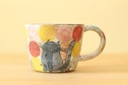 信楽の赤土に白化粧を施し、カラフルにドットを絵付けした中にねこをたたずませました。