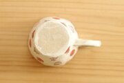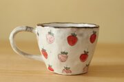 信楽の白土に手びねりでカップを成形し白化粧を施して、ピンクとあかいいちごをふんわりと絵付けしました。