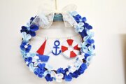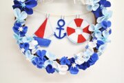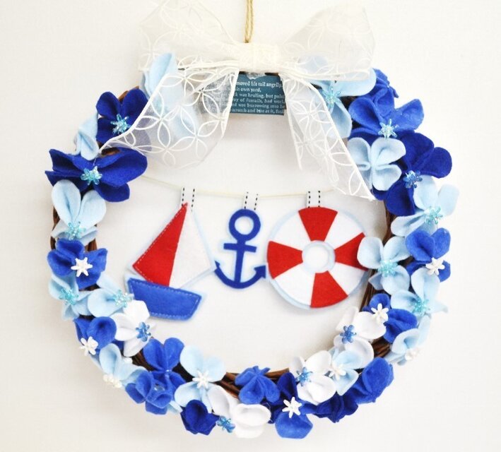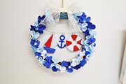 ブルー系のフェルトのお花をリースの周りにあしらって中央にフェルトで作ったイカリ、浮き輪、ヨットを付けた爽やかお洒落なリースの仕上がっています。