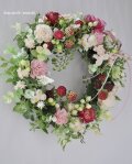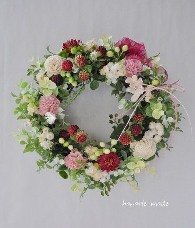 リース土台:ナチュラル素材 直径約20センチ リース素材:アーティフィシャルフラワ-(造花):フランボワーズ・ライトグリーンの実・ベロニカ・ユーカリなど。自然素材:ソーラーローズ・ソーラーカーネション・ブナ・ソフトイモーテル・ムギワラギク・スターフラワー、など。その他:リボン飾り(リボン右上の細い麻紐のリボン飾りは、簡単に枝にかけてありますので取り外しできます。その他のリボン飾りは固定されています。)