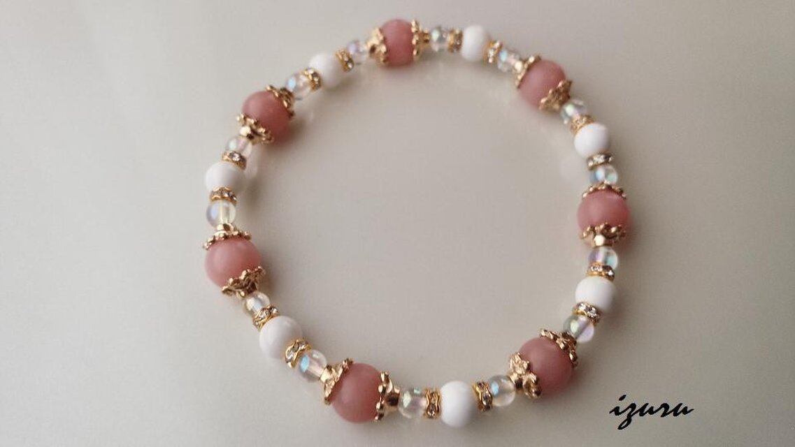 濃いめカラーのピンクオパールとホワイト、ゴールドのパーツを組み合わせました