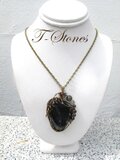 コベライトのタンブルをアンティークゴールドのワイヤーで巻いて、ラブラドライトとスモーキークォーツの丸玉を付けました。