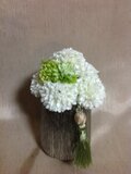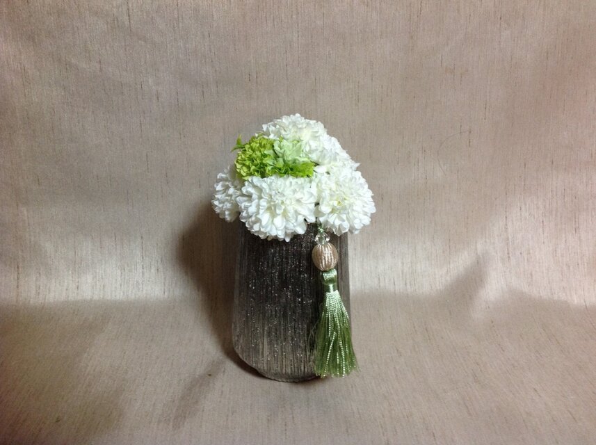 ・アートフラワーの小菊とパール付グリーンタッセルでアクセントをつけたジャパニーズモダンなアレンジです。