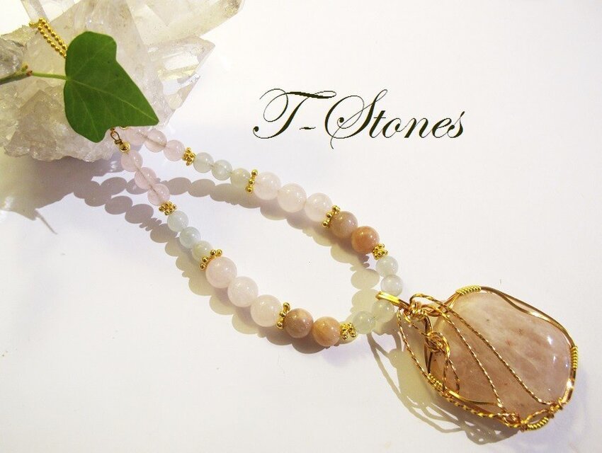 6mmのムーンストーン、8mmのサンストーン、8mmのローズクォーツ、 6mm のムーンストーンとローズクォーツで仕上げました。