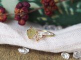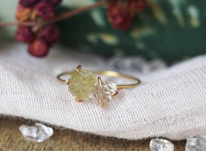 原石のグリーンガーネットとダイヤモンドクォーツのリング