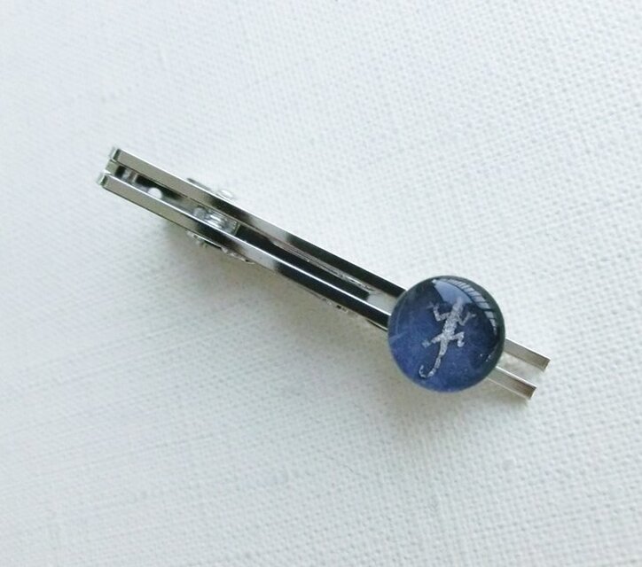 ヤモリを描いた絵を、樹脂で閉じ込めたネクタイピンです。