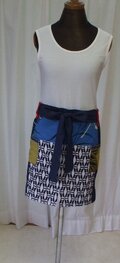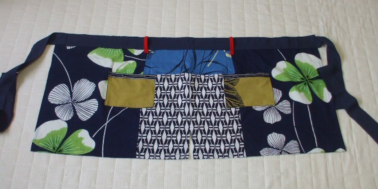 浴衣見本布とほどいた浴衣から(両端の四つ葉のクローバの所がほどいた浴衣です)のリメイクです。紐部分ははちまきでした。そのまま使いました。スカートとしてお召しにということもあるようです。赤い布のタグはスナップで止めるようにしました。紐をしばった後止めることができます。お腹に添うように前にダーツが入っています。