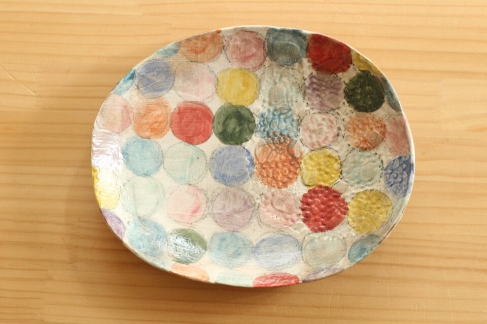 信楽の白土に白化粧を施しカラフルドットを絵付けしました。