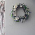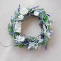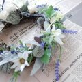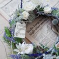 白バラとラベンダー、ミント、タイム等のハーブ、ユーカリ等のリーフ類でリースを作りました。ちょっとガーデンでお花を摘んでまとめたようなナチュラルな雰囲気にしてみました。そんな夏のお庭で音楽会を開いたら素敵だなと思って♫のタグをつけました。