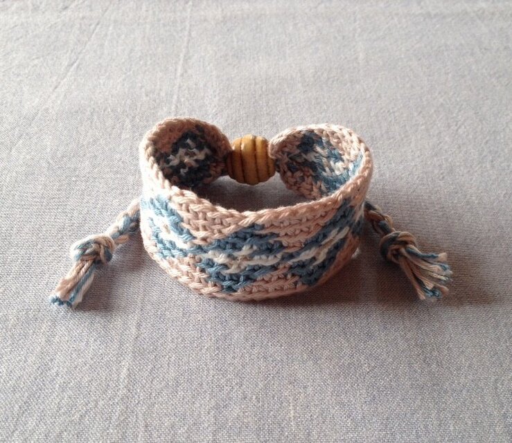 ※以前に出品致しました手編みブレスレットに使った糸は手に入らないため、素材をかえて新たに出品致しました。糸の値段が以前のものより高いため少し価格を値上げしております。どうぞ御了承下さいませ。
