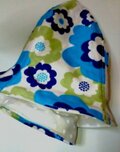 おでかけが楽しくなりそうな、鮮やかなブルー系の花柄の、子供用チューリップハットです。