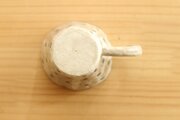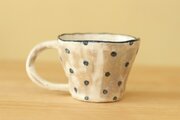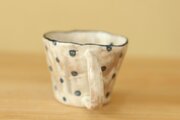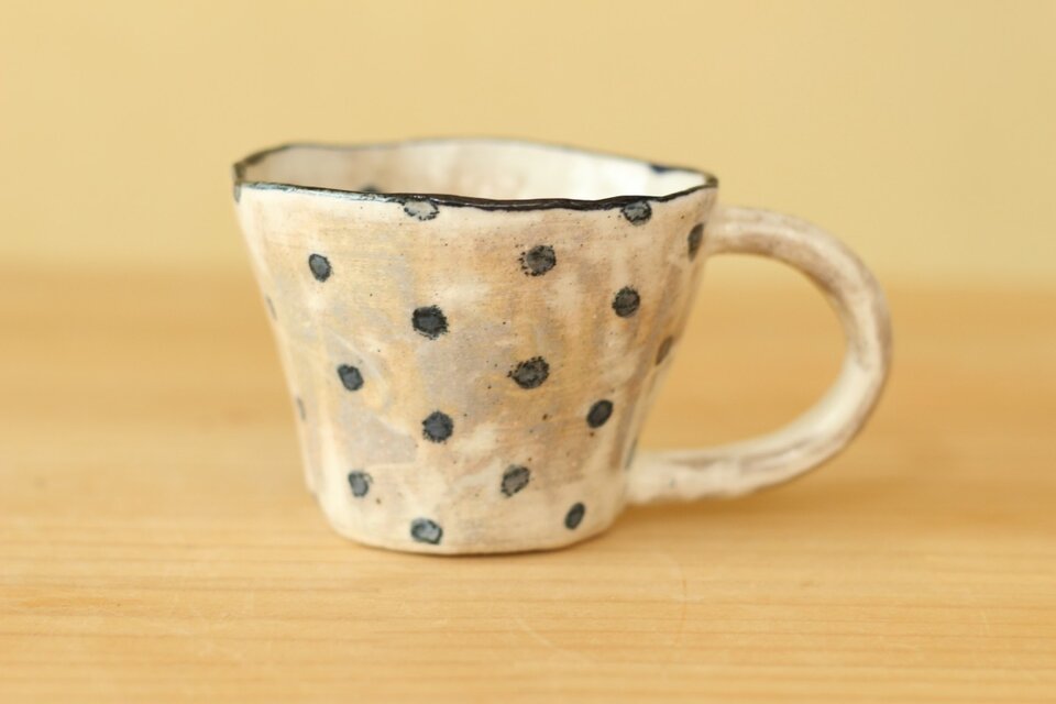 信楽の白土に手びねりでカップを成形し白化粧を施して、ブルーのドットを絵付けしました。
